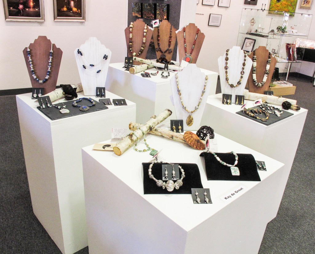Opening Reception for “Impressions-Expressions” featuring featuring jewelry by gallery member K. deGroot and paintings by guest artist, Carol Tarzier, October 28, 2017, from 5-7pm.