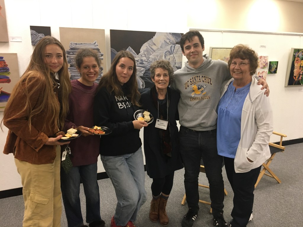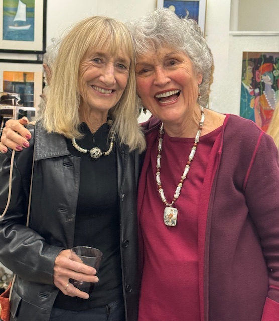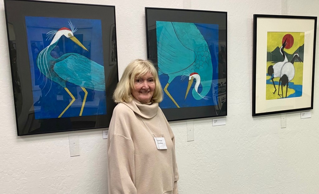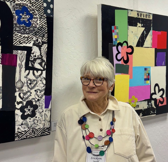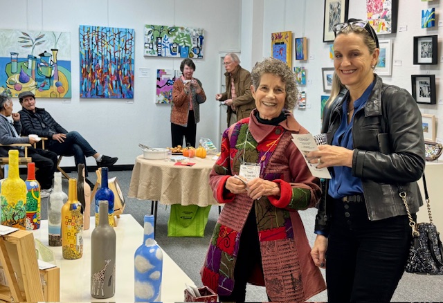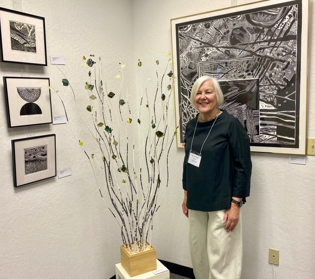 April 12, 2025 marked the reception for Moraga Art Gallery’s new show, “Connections”, which featured Danguole Rita Kuolas’s color and black and white linoleum prints and Susan Erickson’s whimsical, colorful mixed media and collages.