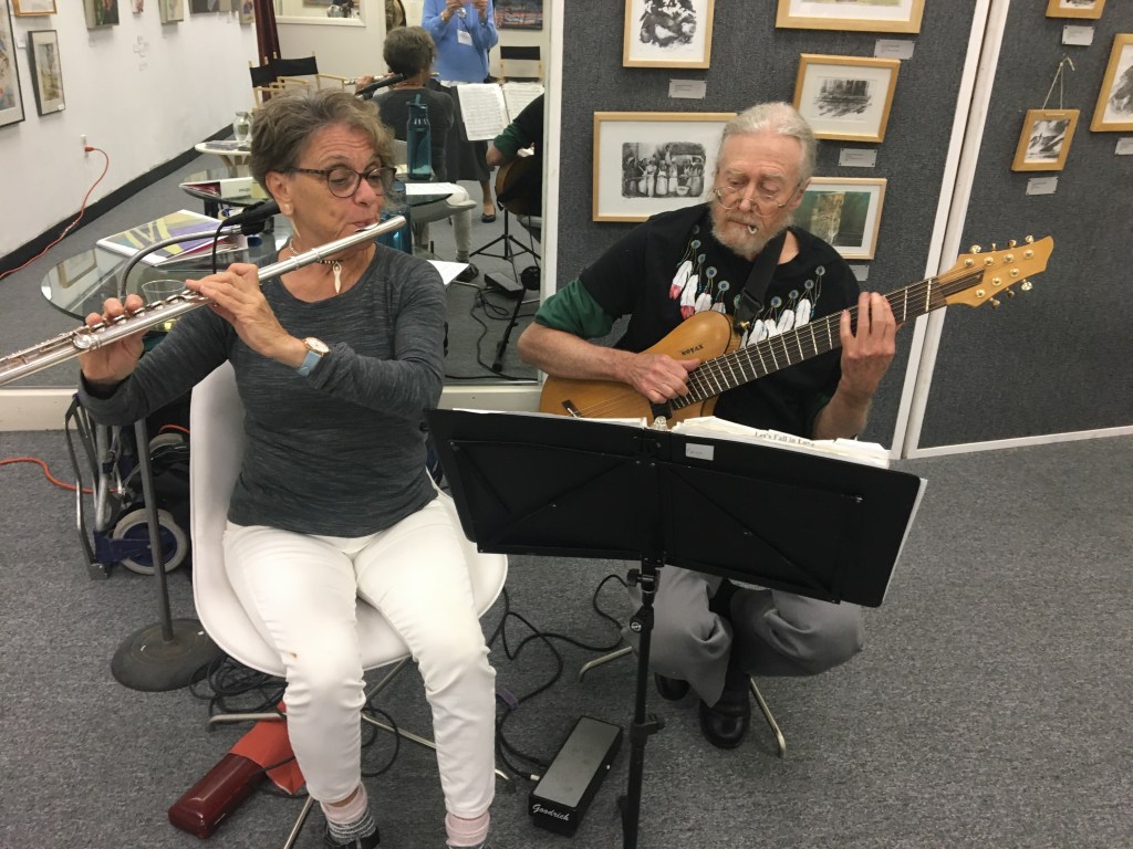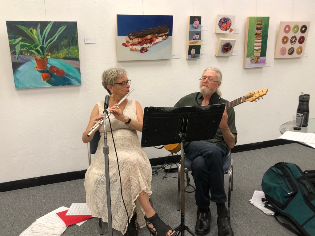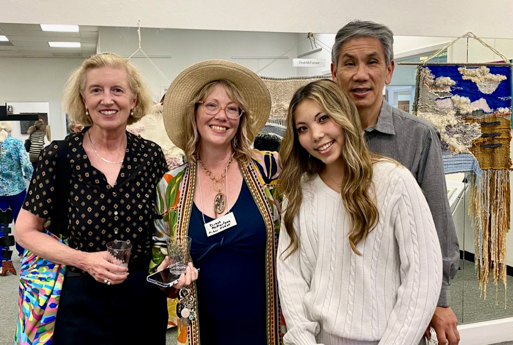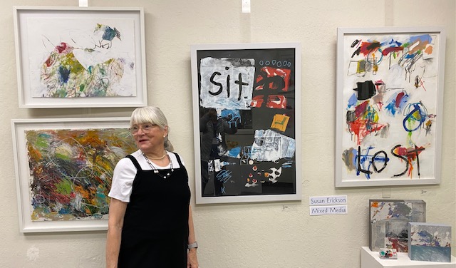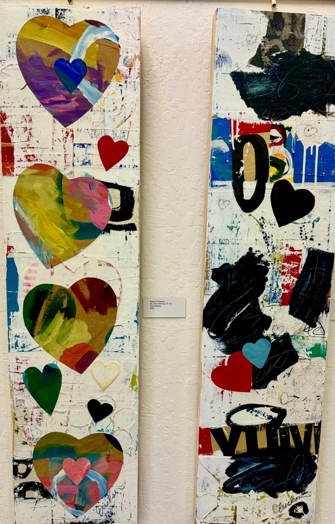 April 12, 2025 marked the reception for Moraga Art Gallery’s new show, “Connections”, which featured Danguole Rita Kuolas’s color and black and white linoleum prints and Susan Erickson’s whimsical, colorful mixed media and collages.