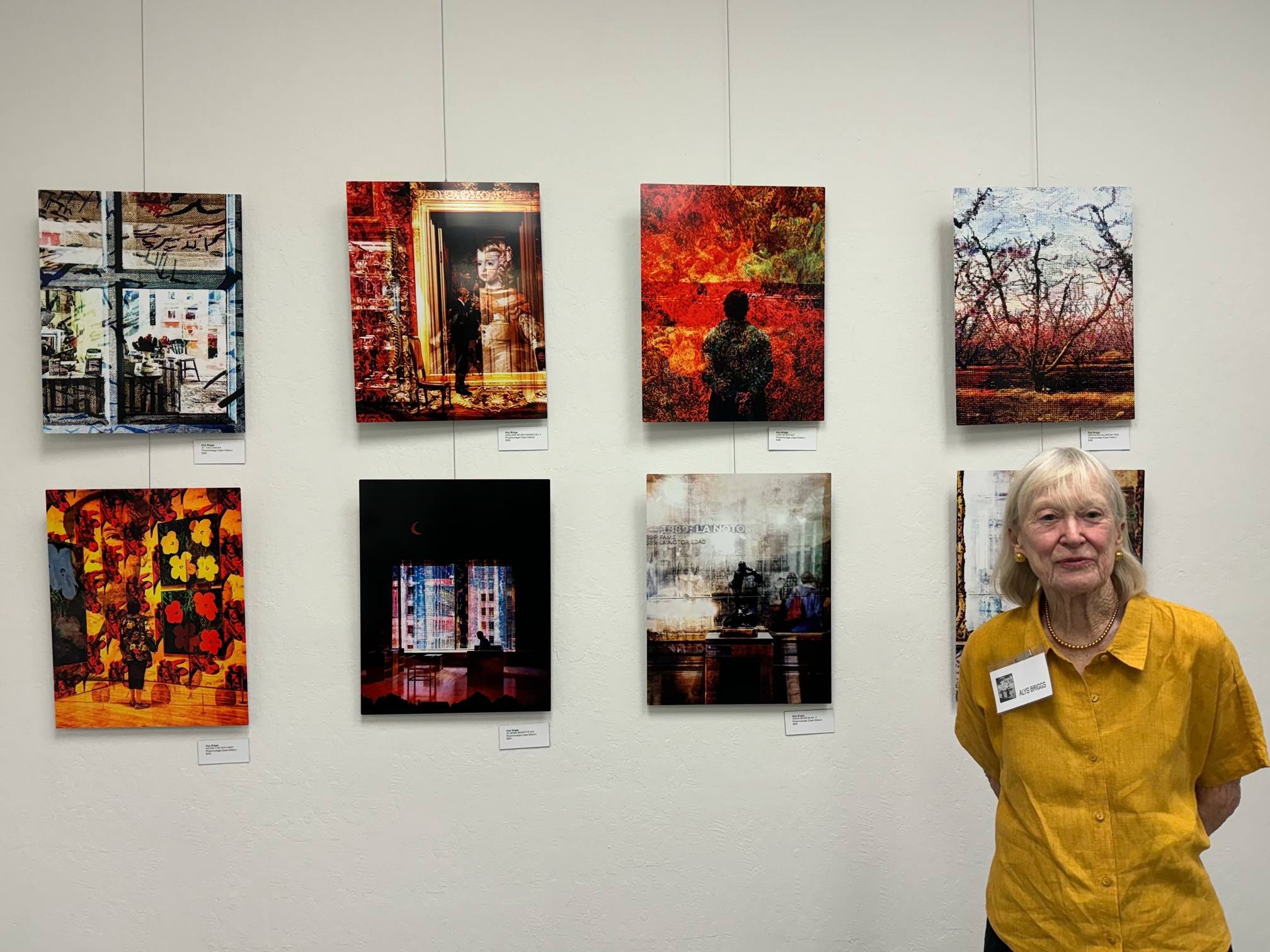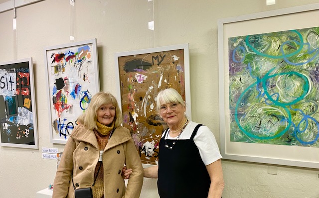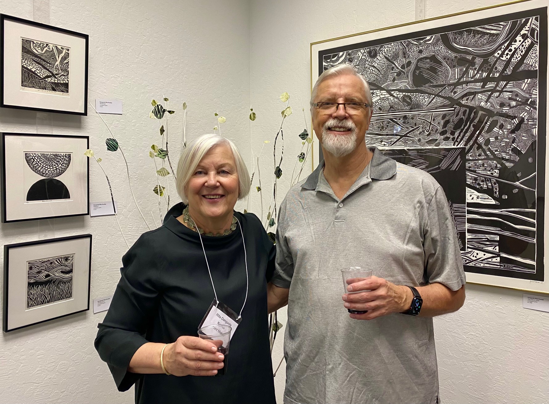April 12, 2025 marked the reception for Moraga Art Gallery’s new show, “Connections”, which featured Danguole Rita Kuolas’s color and black and white linoleum prints and Susan Erickson’s whimsical, colorful mixed media and collages.